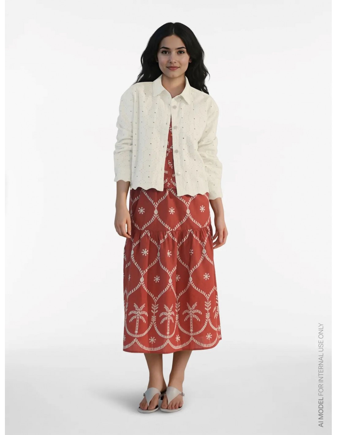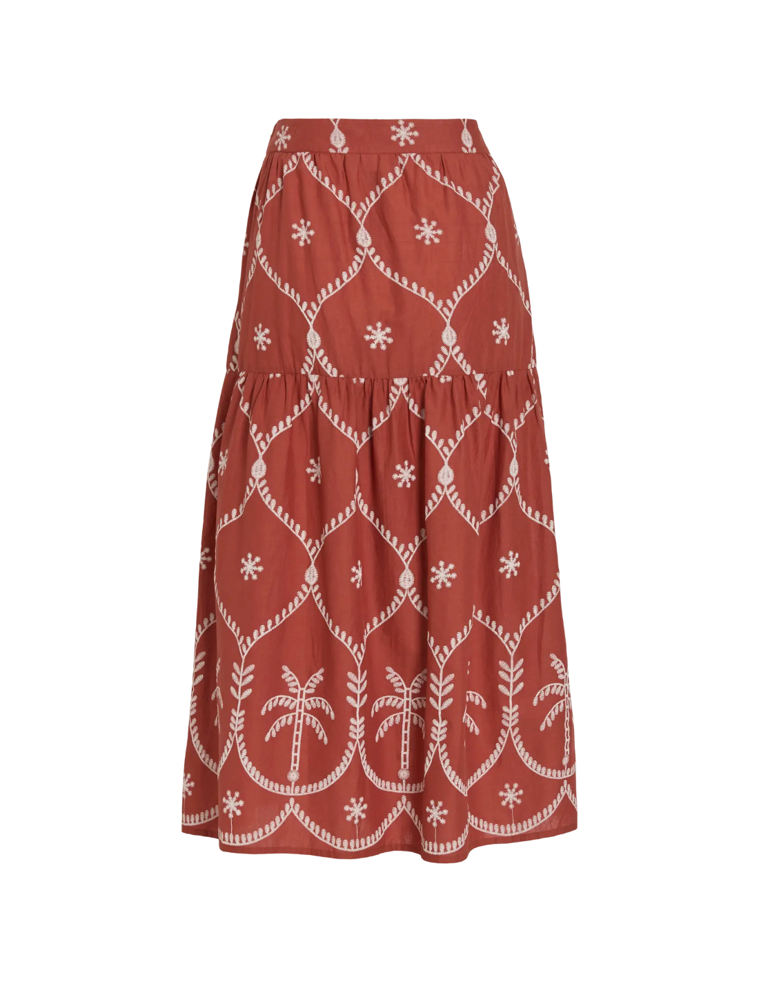 Apportez une touche d’élégance naturelle avec cette jupe longue sublimée par de délicates broderies écrues aux motifs géométriques et palmier, idéale pour un look bohème chic.