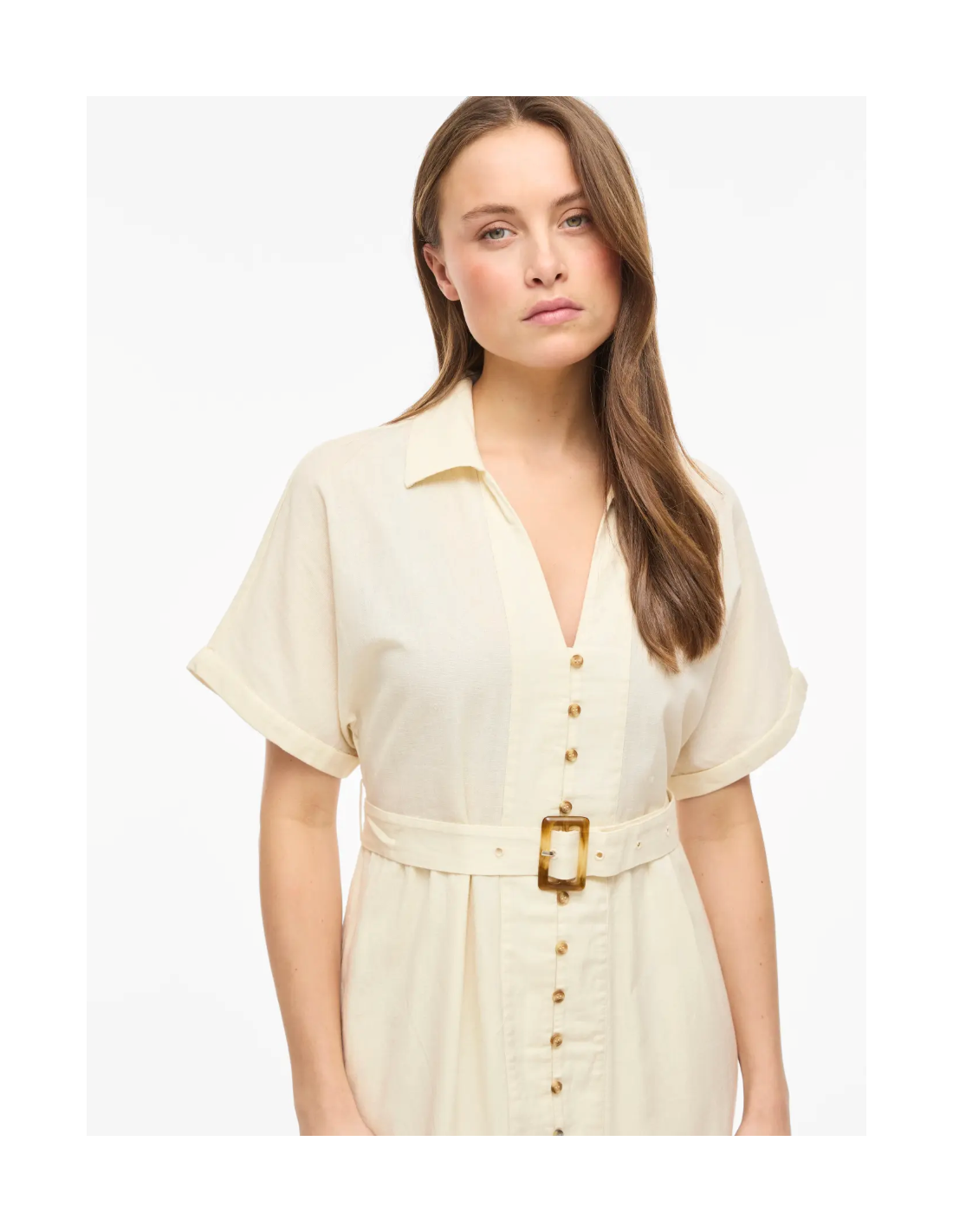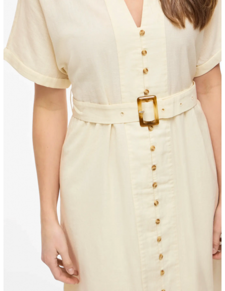 Robe au style naturel et élégant, avec col chemise et fermeture boutonnée sur le devant. Sa ceinture à boucle souligne la taille pour une silhouette féminine, elle est idéale pour un look estival chic et décontracté.