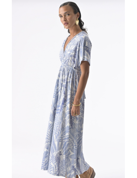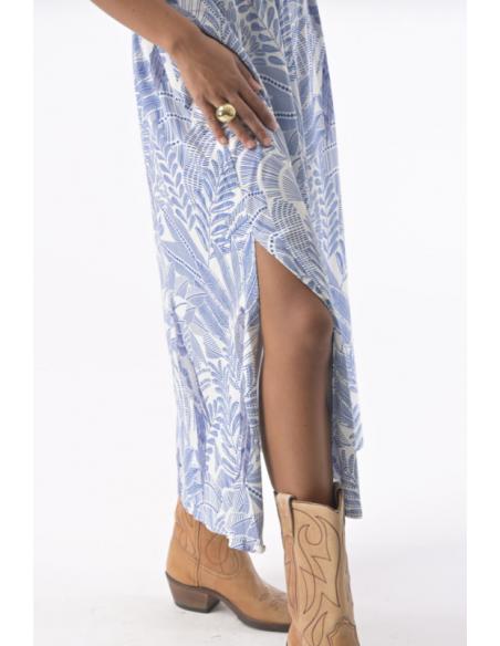 La robe Valentina est une pièce forte, qui mêle imprimés solaires et matières légères pour un look estival plein de caractère, son imprimé graphique et coloré inspiré de paysages donnent toute son identité à la pièce.