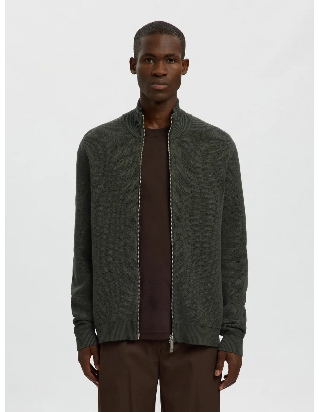 Ce cardigan zippé à col montant offre une interprétation de la maille dans le style sportif.